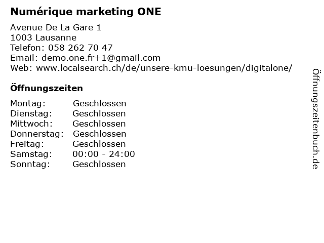 | Öffnungszeiten Numérique marketing ONE in Lausanne anzeigen | |