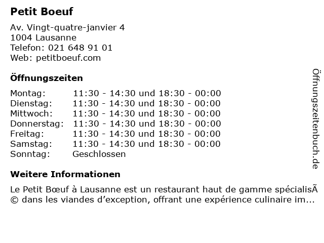 | Öffnungszeiten Petit Boeuf in Lausanne anzeigen | |