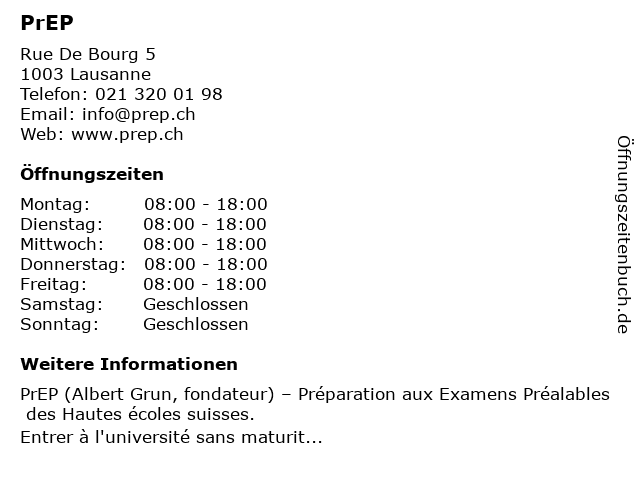 | Öffnungszeiten PrEP in Lausanne anzeigen | |