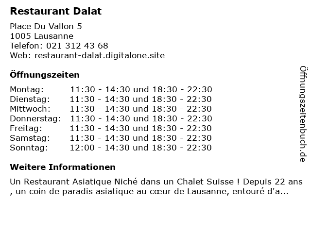| Öffnungszeiten Restaurant Dalat in Lausanne anzeigen | |