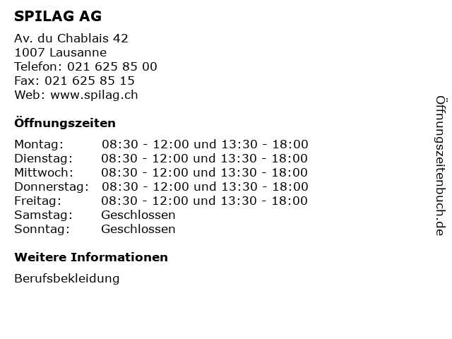 | Öffnungszeiten SPILAG AG in Lausanne anzeigen | |