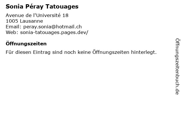 | Öffnungszeiten Sonia Péray Tatouages in Lausanne anzeigen | |