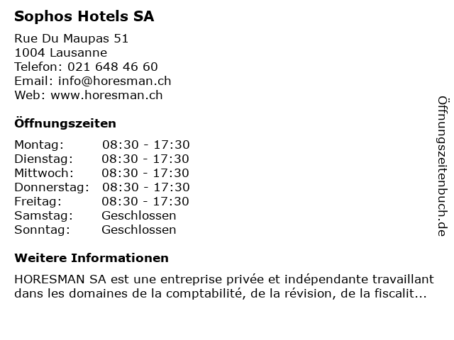 | Öffnungszeiten Sophos Hotels SA in Lausanne anzeigen | |