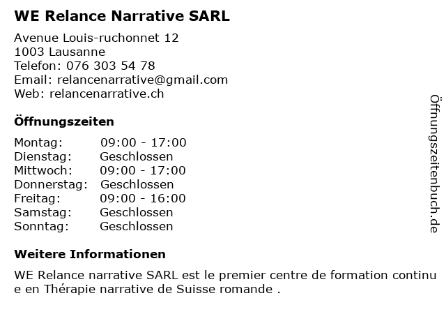 | Öffnungszeiten WE Relance Narrative SARL in Lausanne anzeigen | |