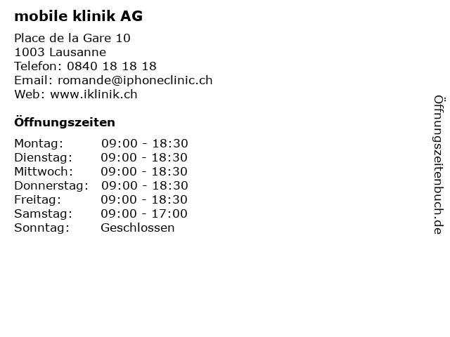 | Öffnungszeiten mobile klinik AG in Lausanne anzeigen | |