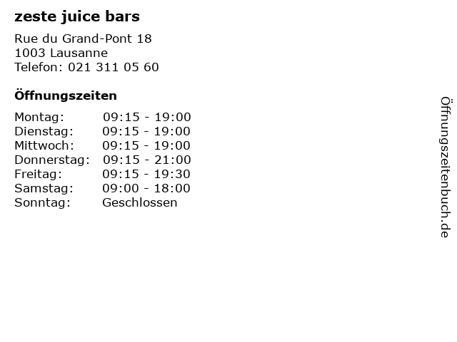 | Öffnungszeiten zeste juice bars in Lausanne anzeigen | |