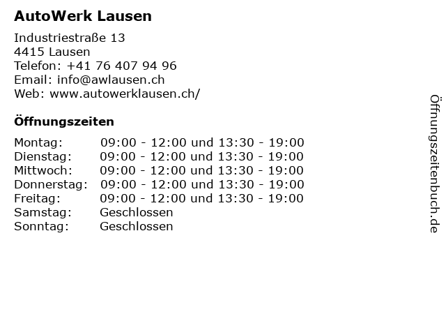 | Öffnungszeiten AutoWerk Lausen in Lausen anzeigen | |