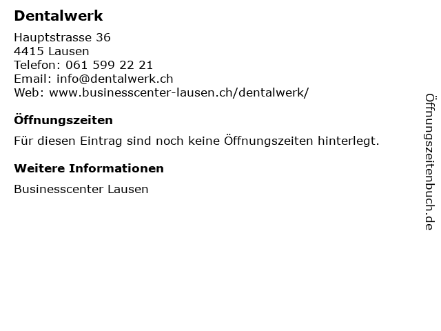 | Öffnungszeiten Dentalwerk in Lausen anzeigen | |