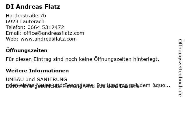 | Öffnungszeiten DI Andreas Flatz in Lauterach anzeigen | |