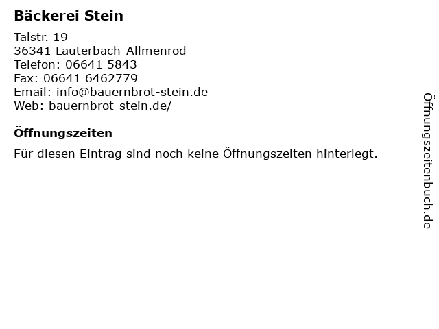 | Öffnungszeiten Bäckerei Stein in Lauterbach-Allmenrod anzeigen | |
