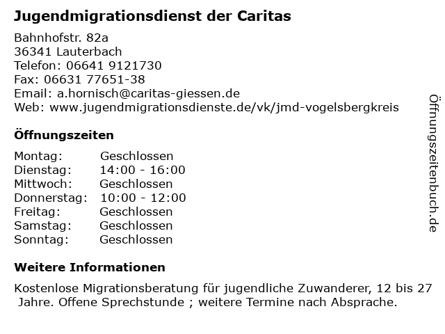 2 Caritas Kinderkiste (Second Hand Kindersachen) (Entfernung: 15,92 km) Georg-Dietrich-Bücking-Str. 20, 36304 Alsfeld 4 DRK Deutsches Rotes Kreuz Kreisverband Lauterbach e.V. (Entfernung: 0,44 km) Hohe Bergstraße 2, 36341 Lauterbach (Hessen) 5 Jugendmigrationsdienst des Internationalen Bundes (Entfernung: 33,83 km) Iglauer Weg 6, 35260 Stadtallendorf 6 |