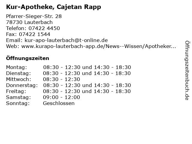 | Telefonnummer Kur-Apotheke, Cajetan Rapp in Lauterbach (07422 4450) anrufen | |