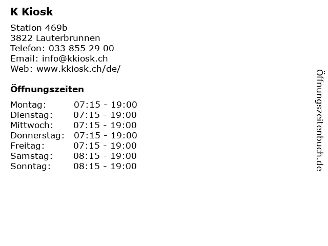 | Öffnungszeiten K Kiosk in Lauterbrunnen anzeigen | |