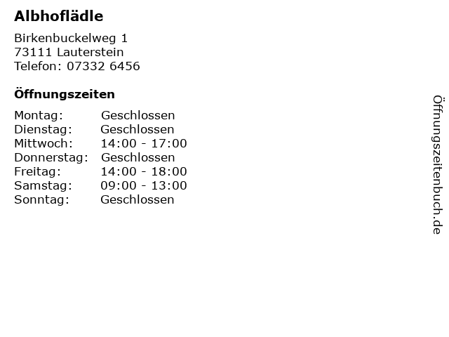 | Öffnungszeiten Albhoflädle in Lauterstein anzeigen | |