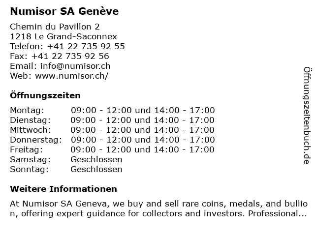 | Öffnungszeiten Numisor SA Genève in Le Grand-Saconnex anzeigen | |