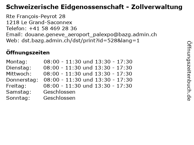 1 Schweizerische Eidgenossenschaft - Zollverwaltung (Entfernung: 0,43 km) Voie des Traz 18, 1218 Le Grand-Saconnex 2 Schweizerische Eidgenossenschaft - Zollverwaltung (Entfernung: 0,77 km) Route de l’aéroport 21, 1215 Genève 3 Schweizerische Eidgenossenschaft - Zollverwaltung (Entfernung: 5,20 km) Route de Meyrin 399, 1217 Meyrin 4 Schweizerische Eidgenossenschaft - Zollverwaltung (Entfernung: 5,25 km) Route du Grand-Lancy 6a, 1227 Les Acacias 5 Schweizerische Eidgenossenschaft - Zollverwaltung (Entfernung: 8,21 km) Route Blanche 24, 1226 Thônex 6 Schweizerische Eidgenossenschaft - Zollverwaltung (Entfernung: 8,28 km) Rue de Genève 154, 1226 Thônex |
