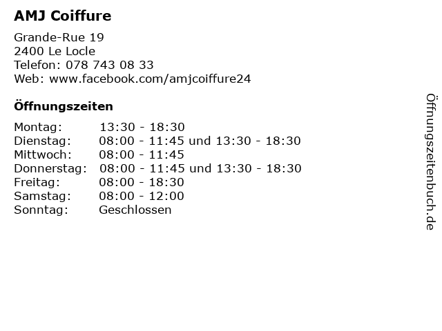 | Öffnungszeiten AMJ Coiffure in Le Locle anzeigen | |
