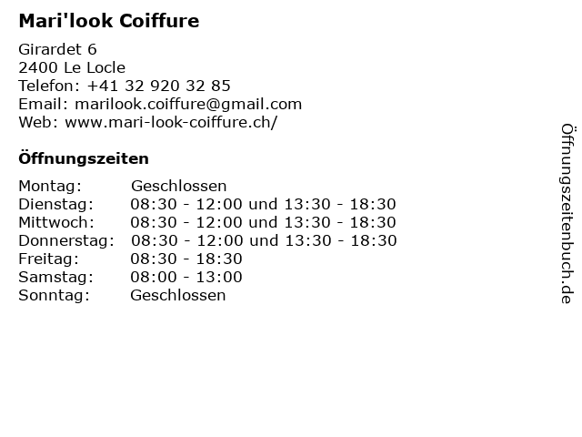 | Öffnungszeiten Mari'look Coiffure in Le Locle anzeigen | |