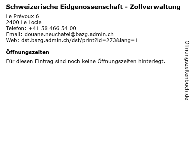 1 Schweizerische Eidgenossenschaft - Zollverwaltung (Entfernung: 7,92 km) Crêt-du-Locle 10, 2304 La Chaux-de-Fonds 2 Schweizerische Eidgenossenschaft - Zollverwaltung (Entfernung: 18,17 km) Point d'appui ferroviaire 1, 2000 Neuchâtel 3 Eidgenössische Zollverwaltung EZV - Le Locle, Dienstabteilung (Veranlagungszeiten Handelswaren) (Entfernung: 2,74 km) Rue de France 91, 2400 Le Locle 4 Eidgenössische Zollverwaltung EZV - Bureau cantonal des métaux précieux (Veranlagungszeiten Handelswaren) (Entfernung: 11,44 km) Avenue Léopold-Robert 67, 2300 La Chaux-de-Fonds 5 Die Schweizerische Post AG - Filiale La Chaux-de-Fonds (Postshop) (Entfernung: 11,58 km) Avenue Léopold-Robert 63, 2300 La Chaux-de-Fonds 6 |