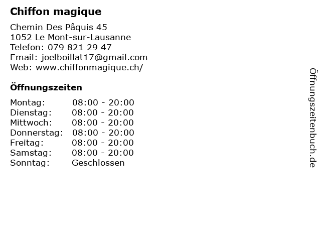 | Öffnungszeiten Chiffon magique in Le Mont-sur-Lausanne anzeigen | |