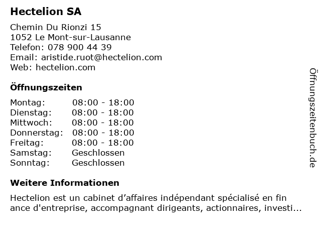 | Öffnungszeiten Hectelion SA in Le Mont-sur-Lausanne anzeigen | |