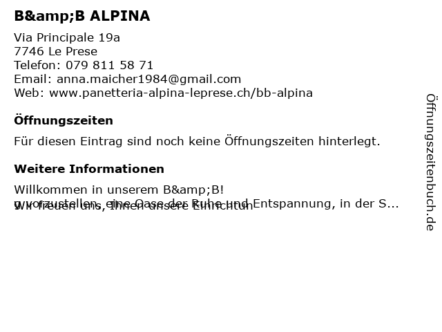 | Öffnungszeiten B&B ALPINA in Le Prese anzeigen | |
