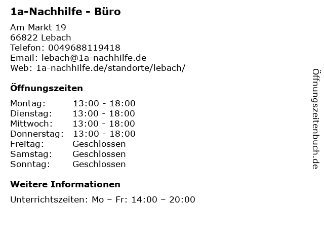 | Öffnungszeiten 1a-Nachhilfe - Büro in Lebach anzeigen | |