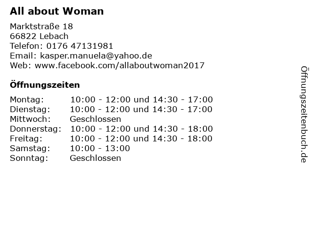 | Öffnungszeiten All about Woman in Lebach anzeigen | |