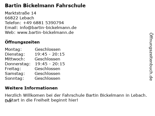 | Öffnungszeiten Bartin Bickelmann Fahrschule in Lebach anzeigen | |