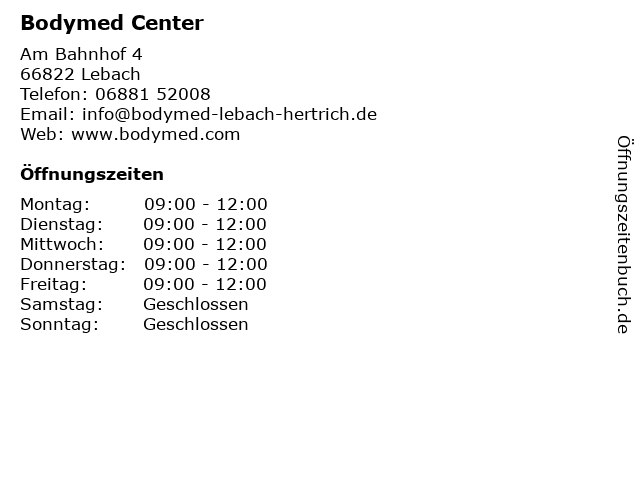 | Öffnungszeiten Bodymed Center in Lebach anzeigen | |