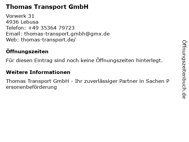 | Öffnungszeiten Thomas Transport GmbH in Lebusa anzeigen | |