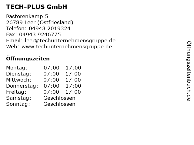 | Öffnungszeiten TECH-PLUS GmbH in Leer (Ostfriesland) anzeigen | |