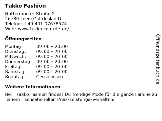 | Öffnungszeiten Takko Fashion in Leer (Ostfriesland) anzeigen | |