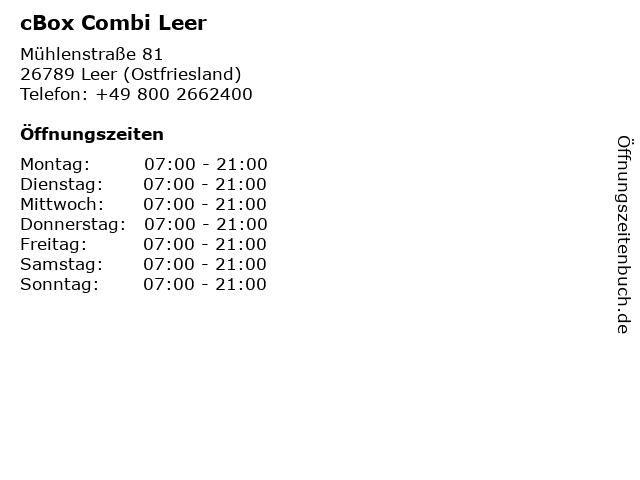 | Öffnungszeiten cBox Combi Leer in Leer (Ostfriesland) anzeigen | |