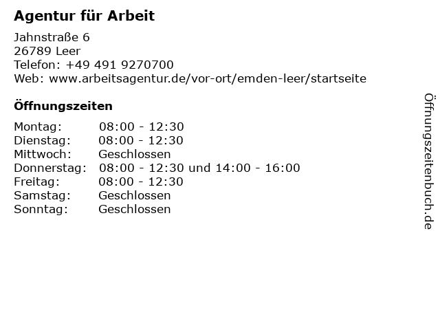 | Öffnungszeiten Agentur für Arbeit in Leer anzeigen | |