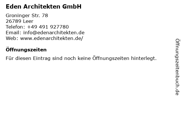 | Öffnungszeiten Eden Architekten GmbH in Leer anzeigen | |