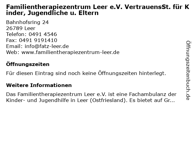 | Familientherapiezentrum Leer e.V. VertrauensSt. für Kinder, Jugendliche u. Eltern anrufen | |