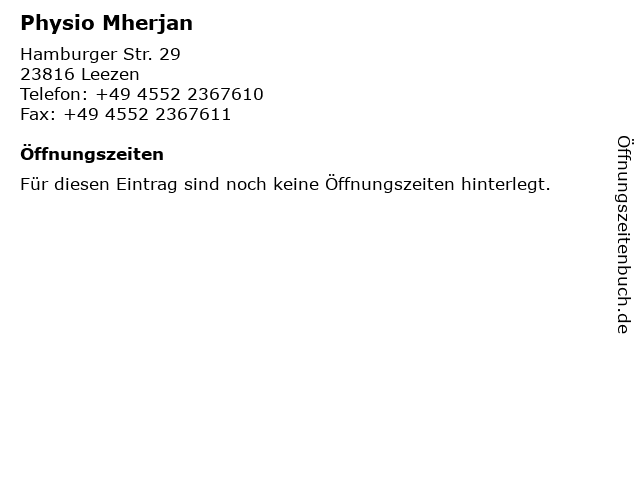 | Öffnungszeiten Physio Mherjan in Leezen anzeigen | |