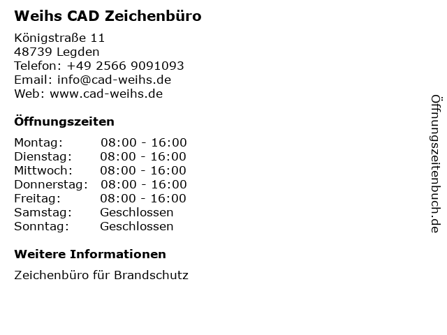 | Öffnungszeiten Weihs CAD Zeichenbüro in Legden anzeigen | |