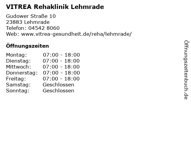 | Öffnungszeiten VITREA Rehaklinik Lehmrade in Lehmrade anzeigen | |