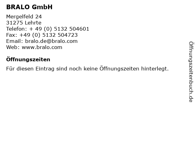 | Öffnungszeiten BRALO GmbH in Lehrte anzeigen | |
