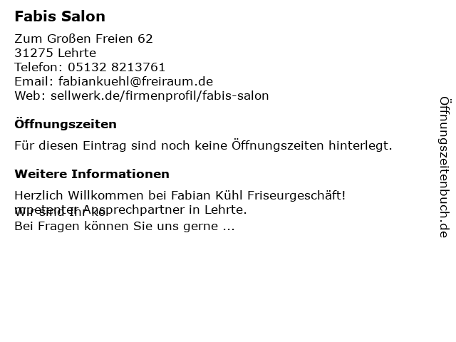 | Öffnungszeiten Fabis Salon in Lehrte anzeigen | |