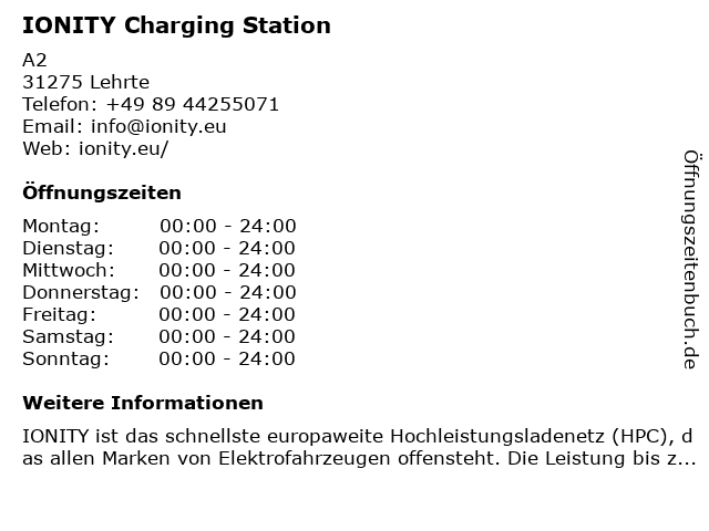 | Öffnungszeiten IONITY Charging Station in Lehrte anzeigen | |