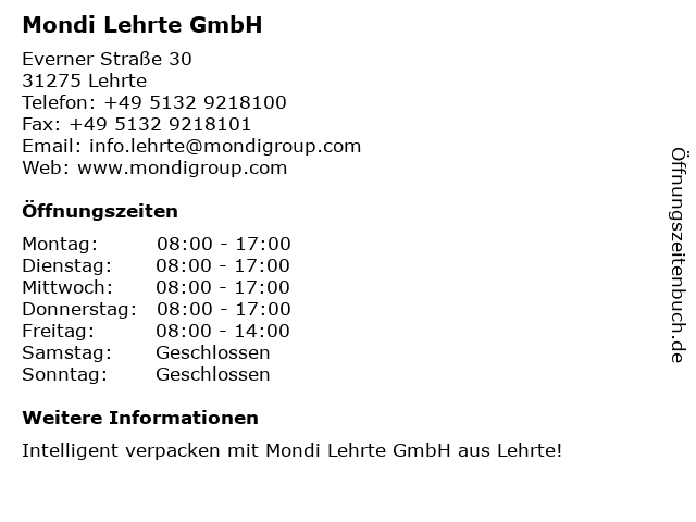 | Öffnungszeiten Mondi Lehrte GmbH in Lehrte anzeigen | |