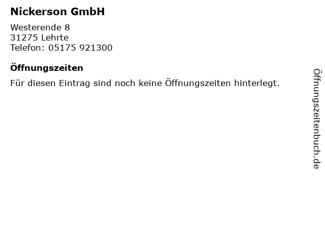 | Öffnungszeiten Nickerson GmbH in Lehrte anzeigen | |
