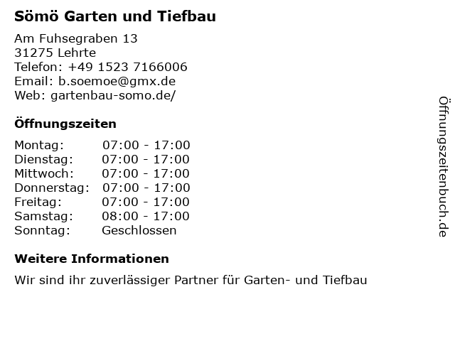 | Öffnungszeiten Sömö Garten und Tiefbau in Lehrte anzeigen | |