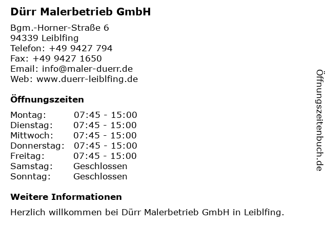 | Öffnungszeiten Dürr Malerbetrieb GmbH in Leiblfing anzeigen | |