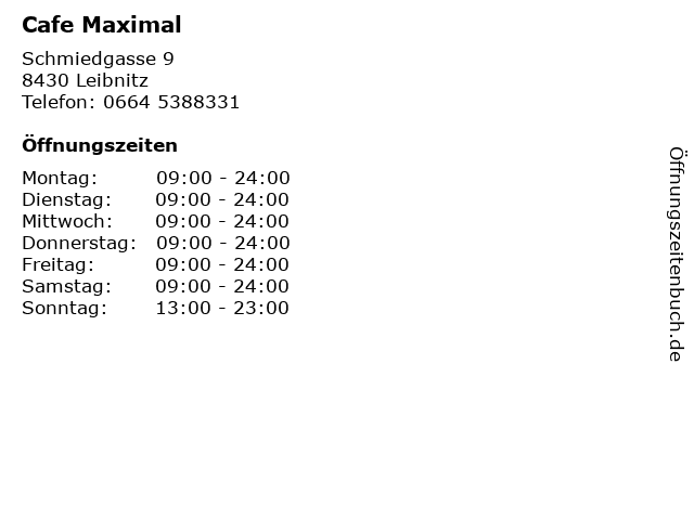 | Öffnungszeiten Cafe Maximal in Leibnitz anzeigen | |
