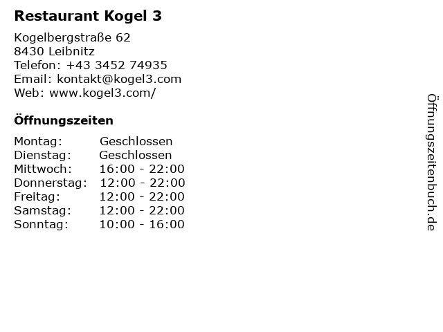 | Öffnungszeiten Restaurant Kogel 3 in Leibnitz anzeigen | |