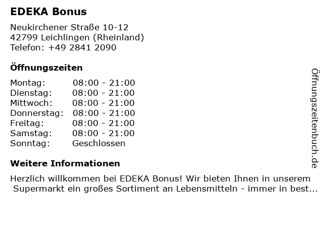 | Öffnungszeiten EDEKA Bonus in Leichlingen (Rheinland) anzeigen | |